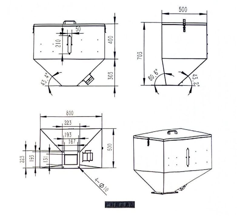 1.招標(biāo)文件附件《貴州省密集烤房生物質(zhì)顆粒燃料內(nèi)置式燃燒機(jī)購置應(yīng)用技術(shù)要求規(guī)范》“送料器”——“a)貯料箱”部分——“圖5 貯料箱及檔料板示意圖”以下圖為準(zhǔn):